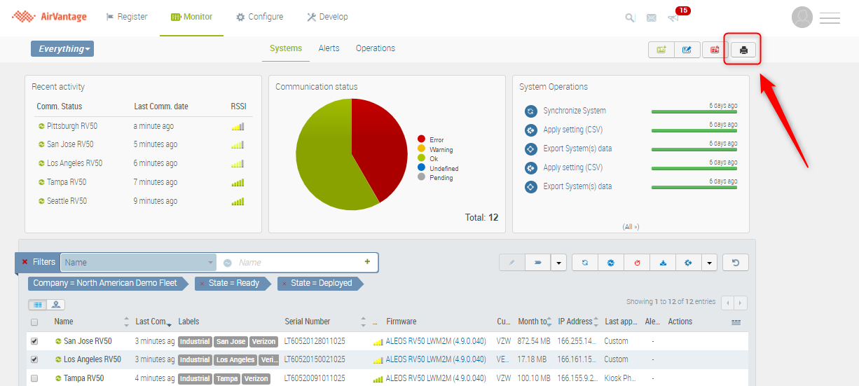 A “print” button has been added to the Start Page (Dashboard), Monitor -> Systems, and Device pages, allowing you to print those pages.