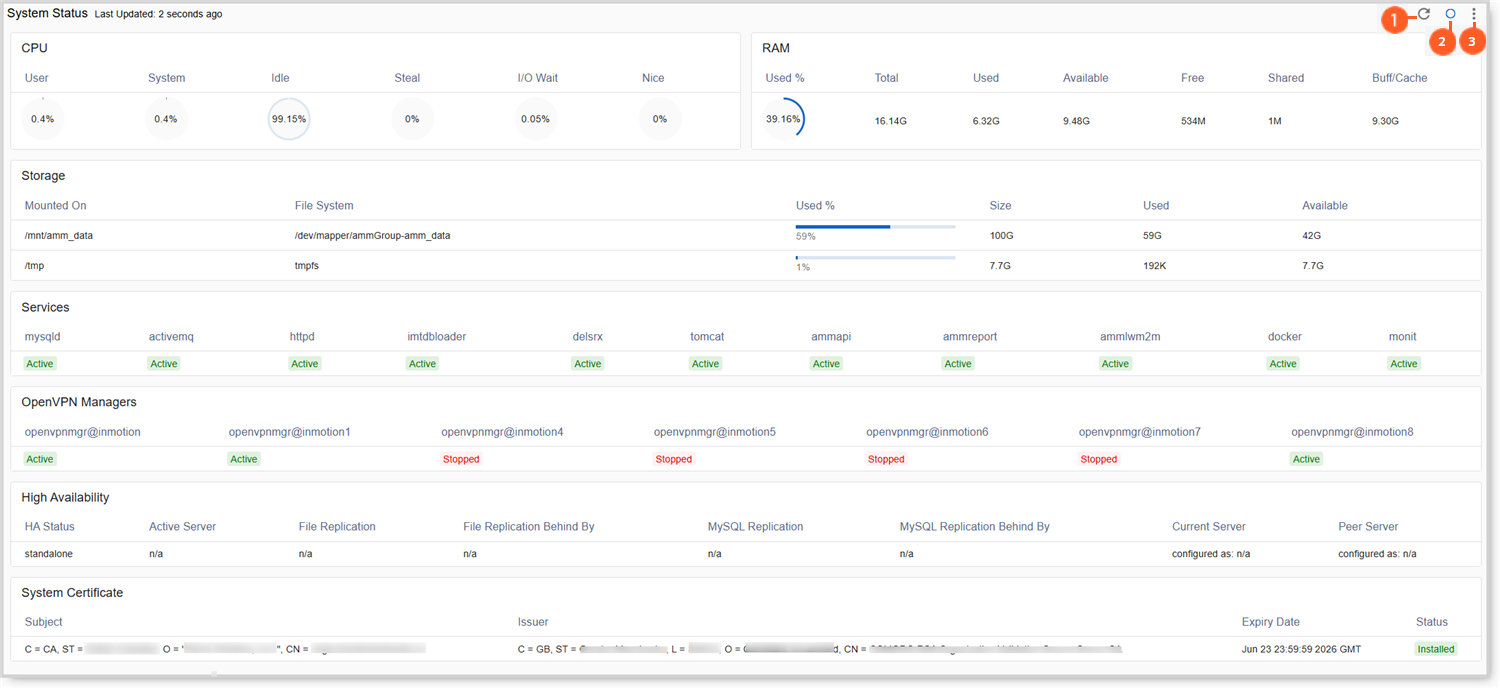 The System Status panel provides an overview of the AMM, allowing the administrator to see how the AMM is performing at a glance.