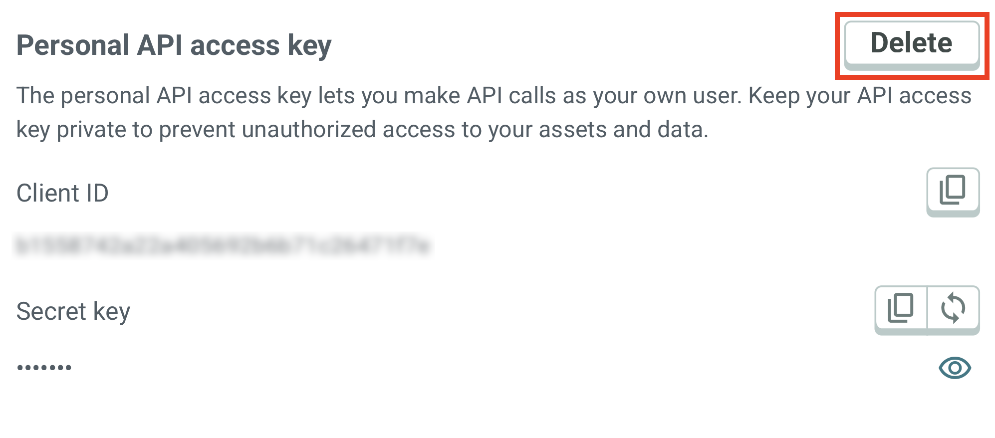When you no longer need your personal API access key, you can permanently delete it. This action will immediately revoke access for any applications using this client’s credentials.