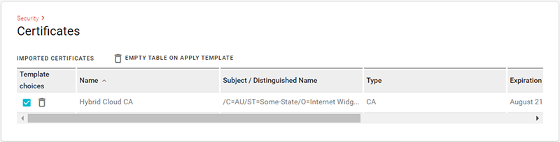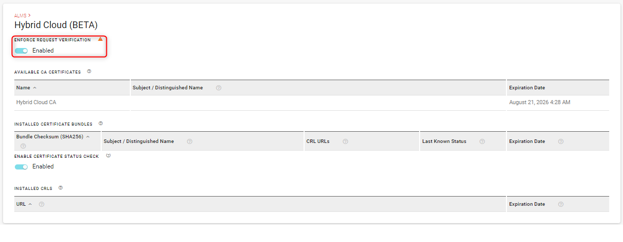 You can confirm this by checking the router configuration. Under System > ALMS > Hybrid Cloud, ENFORCE REQUEST VERIFICATION will be enabled and the certificate appears in the AVAILABLE CA CERTIFICATES table. The certificate is also listed under System > Security > Certificates in the IMPORTED CERTIFICATES table.