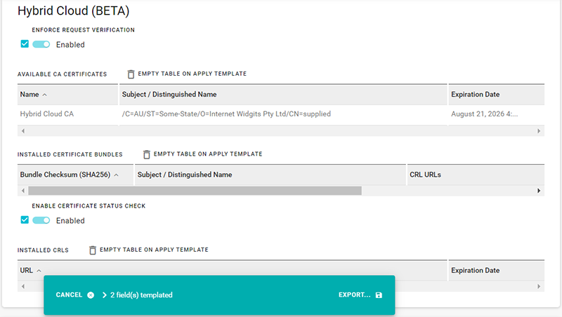 Create a template from a configured router that includes the desired settings to preserve the router’s configuration. At a minimum, include the Hybrid Cloud (Beta) settings and the imported certificates, as shown below. You should also include any firewall rules and custom APN values in the template if your configuration requires them to be reapplied after a router reset.