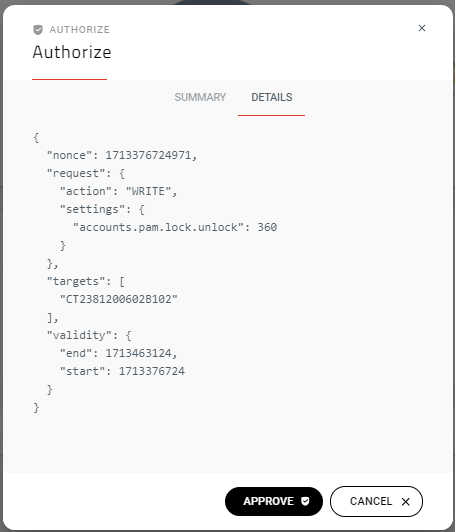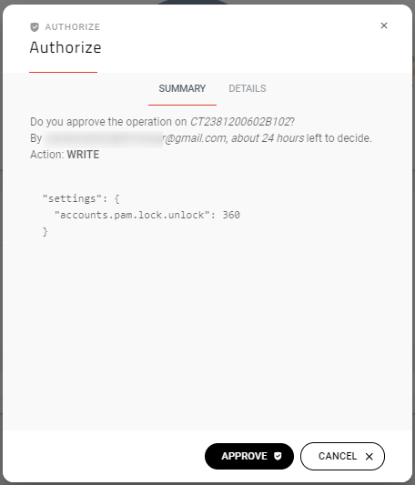 After clicking Authorize, an Authorize window opens, showing the operation details for you to review. You can click APPROVE or CANCEL from there. The following steps assume that you are authorizing the operation.
