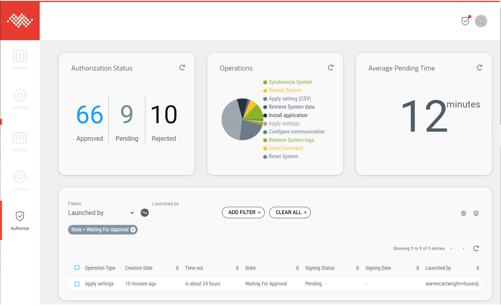 There is only one significant operation change for users, once Hybrid Cloud is enabled on the account. Now, when you initiate an operation that needs to execute on the device, rather than immediately moving to the “In Progress”, it is displayed in the Operations timeline in the “Waiting For Approval” state. The state will update after the Authorizer approves or rejects the operation.