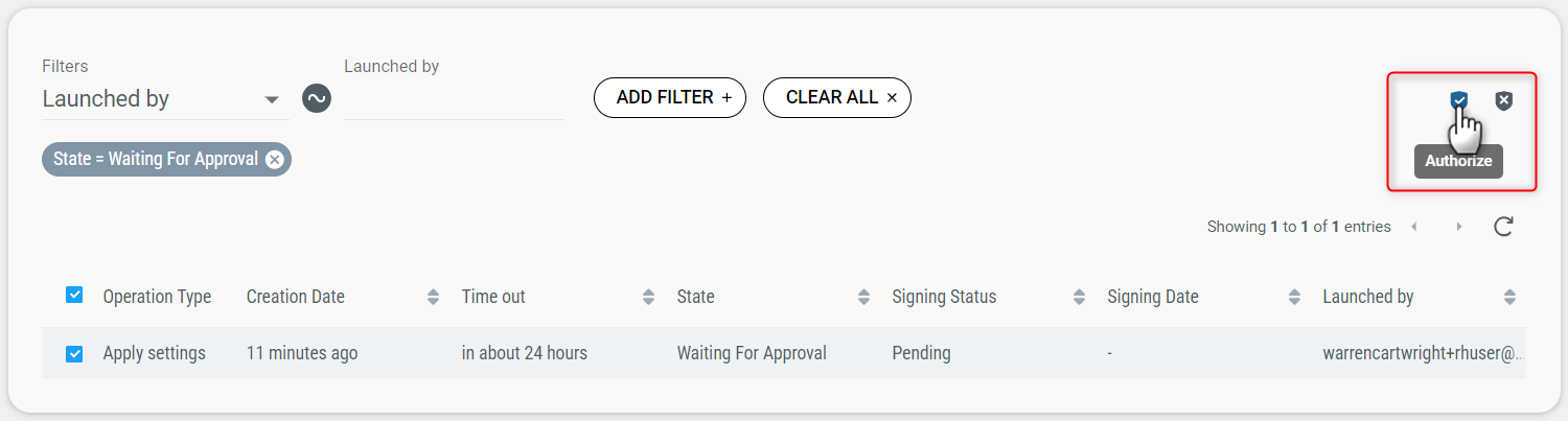 After you click Authorize, a new browser tab opens, and all the operations waiting for approval are displayed.